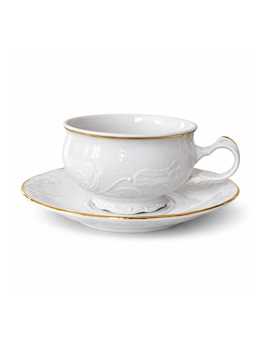 Adaugă o notă de eleganță și rafinament în casa ta cu acest model din portelan premium. Detaliile delicate ale modelului si ghirlanda de lalele in relief, aduc un plus de frumusețe oricărei mese. Decorat manual cu o margine de aur lucios.