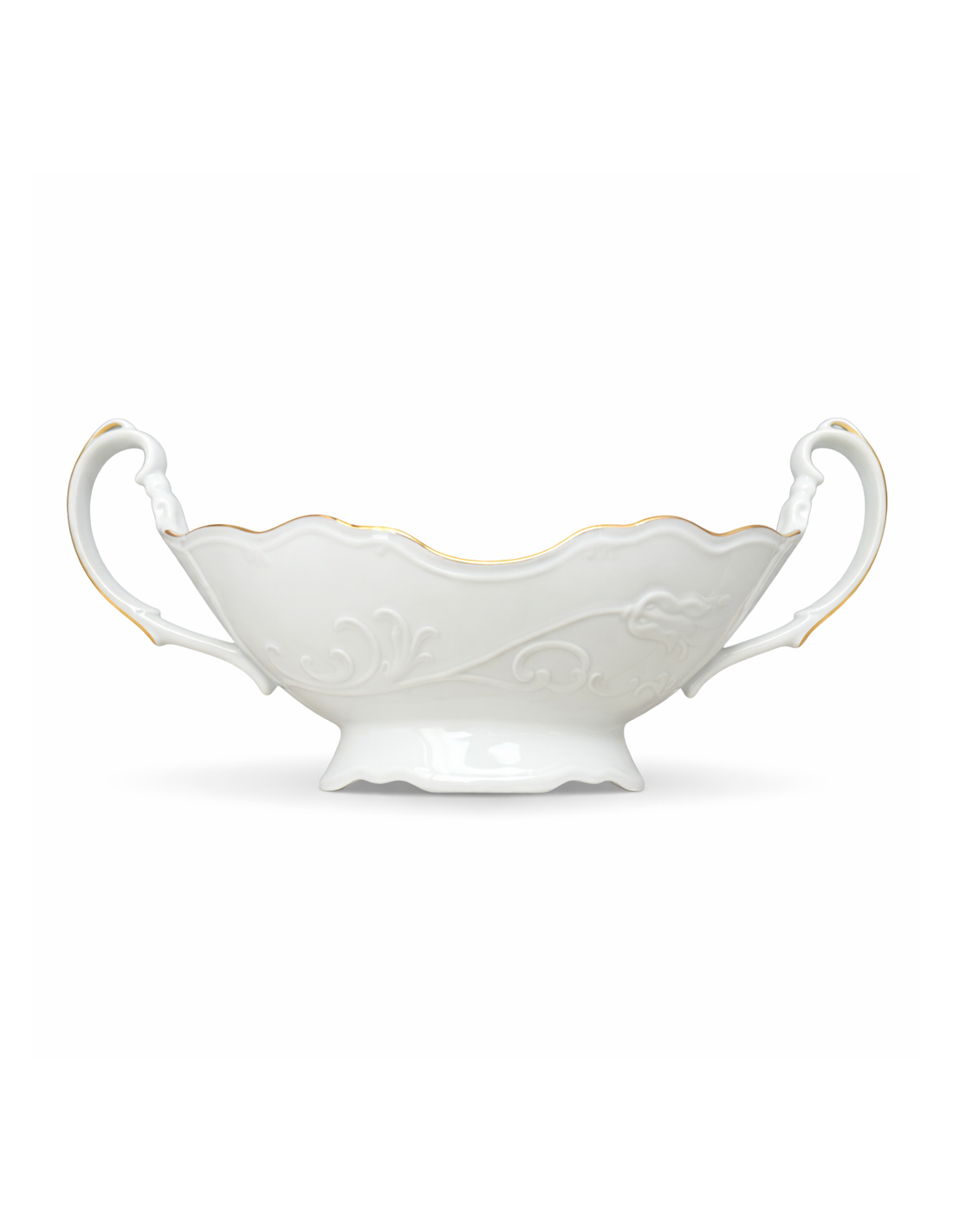Fructieră ovală 36 cm din porțelan premium, model Tulip Rand Aur, cu relief floral și margine decorată cu rand de aur.