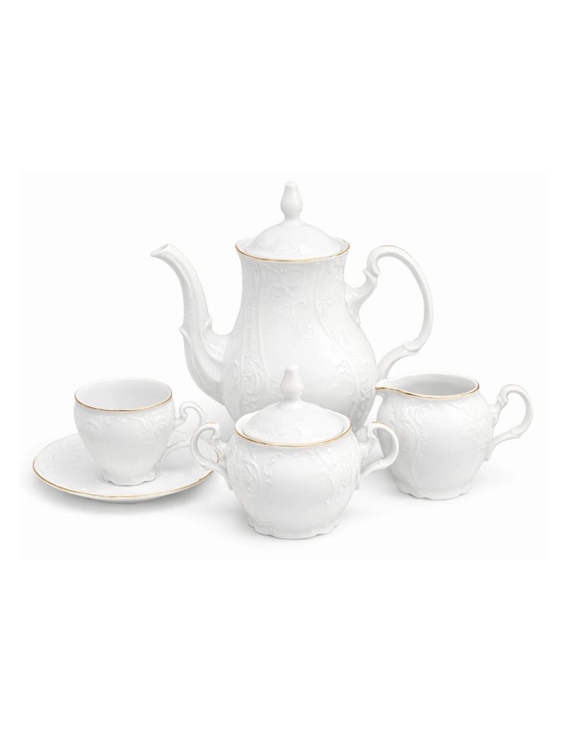 Serviciu de cafea/cappuccino din porțelan premium alb, 15 piese pentru 6 persoane, cu relief in stil baroc și rand elegant de aur lucios, trasat manual.