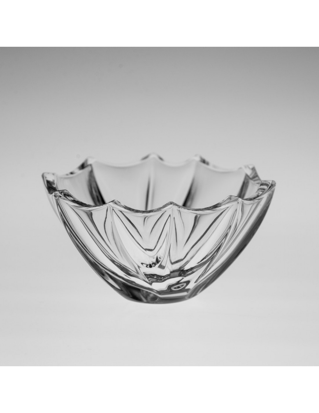 Bol Calypso 12.5 cm, realizat din cristal Bohemia, se remarcă printr-un design sculptural dinamic, caracterizat de forme neregulate și reliefuri bine definite. Suprafața reflectă lumina în multiple direcții, evidențiind claritatea și calitatea cristalului.